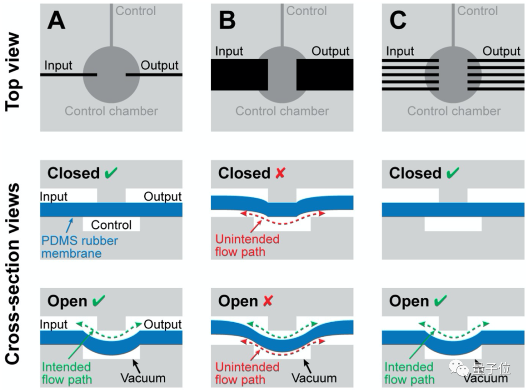 能够实现记忆、维持机器人执行器状态,主要靠的就是这个微流控阀,它最初是被用在微流控芯片上控制液体流动,这些阀门能够在气流供应断开时,仍旧保持压力差存在。