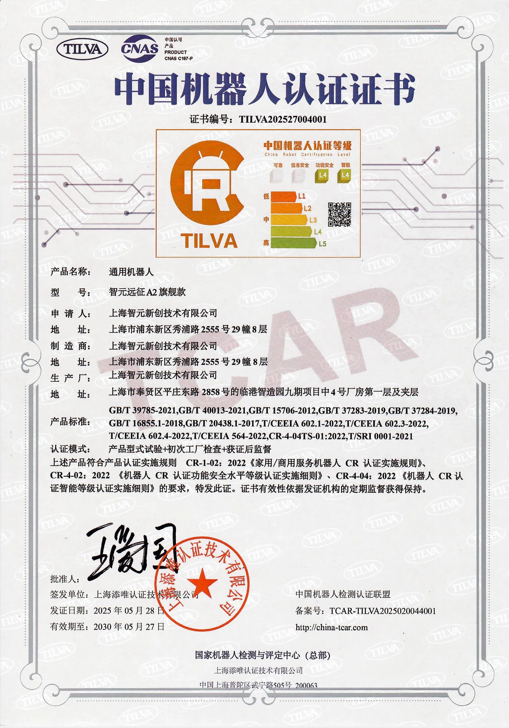 智元远征A2机器人凭借领先的技术、卓越的性能和严格的质量控制,顺利通过机械电气安全、电磁兼容性、功能安全、智能化等全方位检测评估,成为全球首个获得CR认证的人形机器人产品。