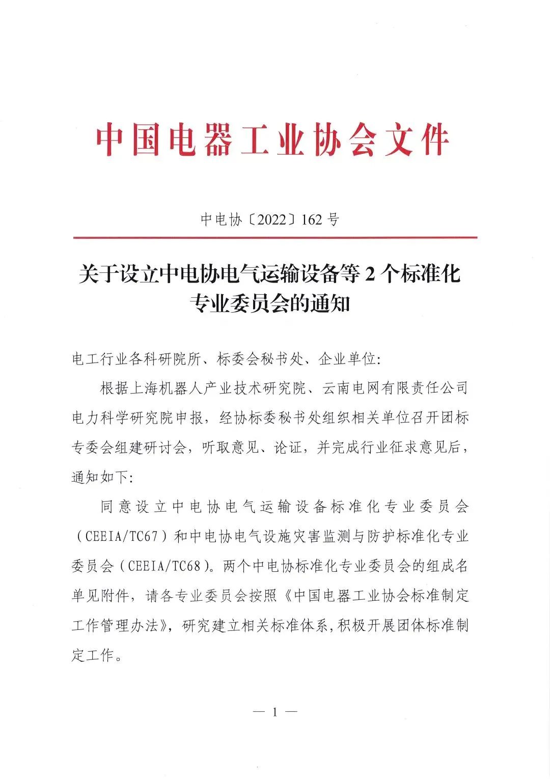 2022年10月20日,中电协[2022]162号文件下达了《关于设立中电协电气运输设备等2个标准化专业委员会的通知》,同意设立中电协电气运输设备标准化专业委员会(CEEIA/ TC67),秘书处挂靠单位为东升国际(中国)机器人有限公司官网。